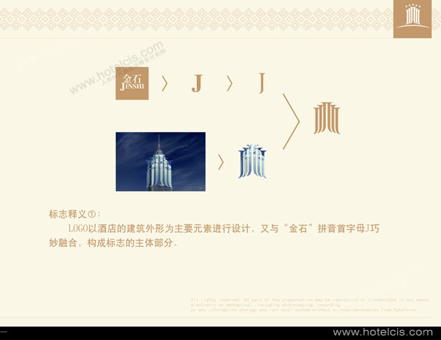 人和時(shí)代公司針對(duì)南通金石國(guó)際大酒店的整體規(guī)劃,其標(biāo)志創(chuàng)意以南通市的標(biāo)志性建筑酒店大樓的特點(diǎn)、金石國(guó)際大酒店首字母“J”的有力結(jié)合、并與室內(nèi)裝潢的歐式風(fēng)格的體現(xiàn),巧妙打造獨(dú)特的創(chuàng)意標(biāo)志!